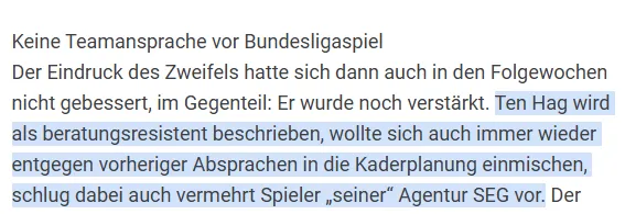 无论是在球场上、内部会议中还是公共关系层面——滕哈格的所作所为处处都让同事感到难以置信。随后的数周里,这种质疑持续加剧。滕哈格被描述为拒绝接受建议,屡次试图违反先前协议干预阵容规划,并越来越多地推荐来自他自己的经纪公司SEG的球员。